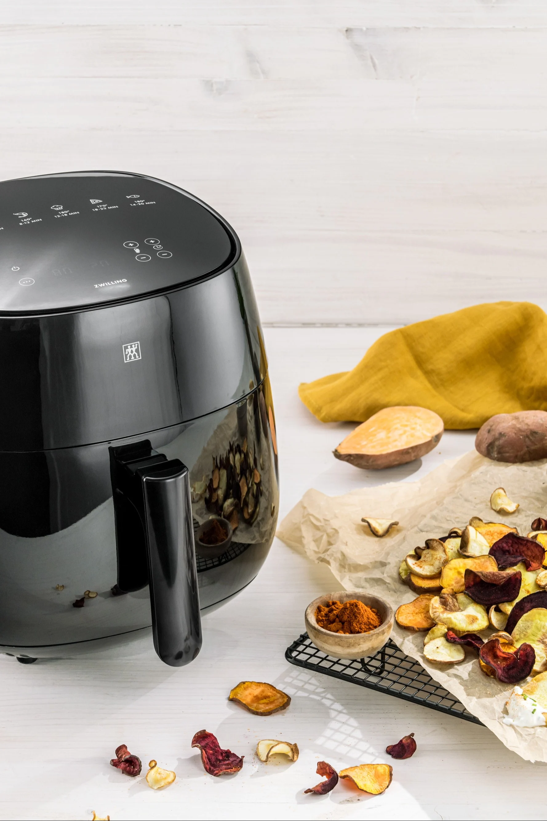 Tips! Arbejd med teksturer i din madlavning, og snit zucchini med et mandolinjern. Stykkerne friteres herefter i din airfryer og kan anvendes som topping til den respektive ret.